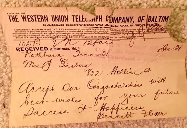 M&M D Lipsitz Wedding Telegram from Bennett Flexer