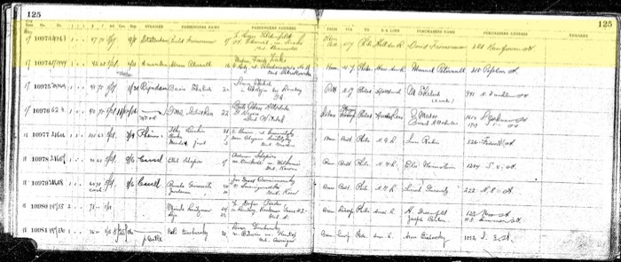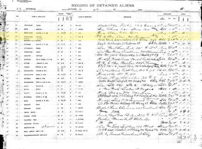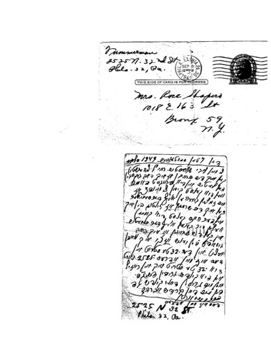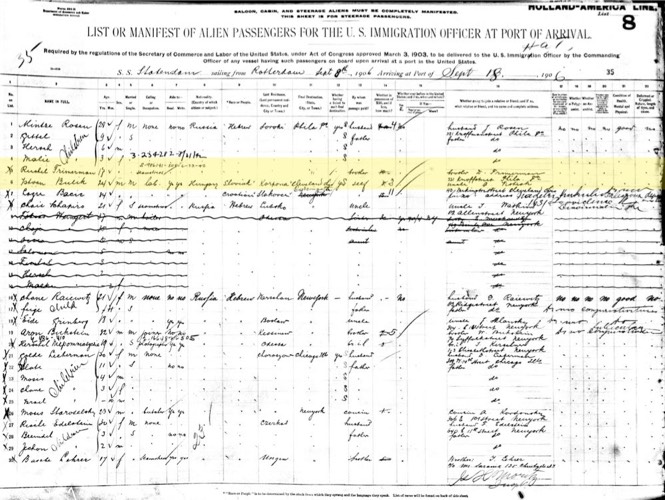 Immigrant Bank Book showing the purchase of a steamship ticket by David Frimerman of 321 Kaufman Street, Philadelphia for his sister Ruchel (Rose) Frimerman. The ticket was for passage from Vienna, via Rotterdam to Phiadelphia, via New York City. Purcahsed on 17 May 1906, paying for transportation on the SS Stattendam, Holland America Line, Departure scheduled Sept 8th 1906. The ticket was sent to: ℅ Leizen Goldenfeld (21)? Florescht St. Soroki, Bessarabia Gubernia.