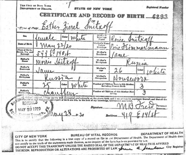 Esther Zirel Snitkoff (Roberta Baron) Birth Certificate