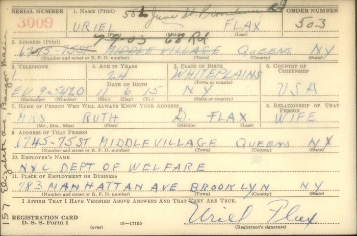 Uriel Flax WWII Draft Registration Card-Front