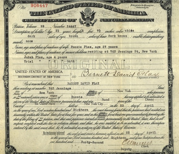 Barnett Flax Naturalization Certificate 23 April 1918. US District Court - Southern District of New York.
