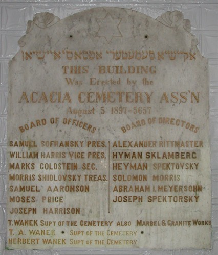Plaque dedicating the building at the entrance to Accacia Cemetery, Ozone Park, NY