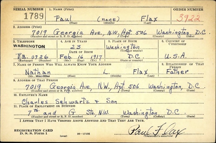 Paul Flax WW II Draft Reg Card-Front