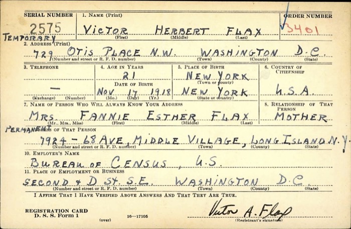 Victor Flax WW II Draft Reg. Card-Front