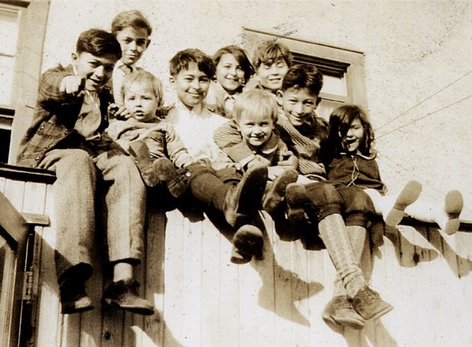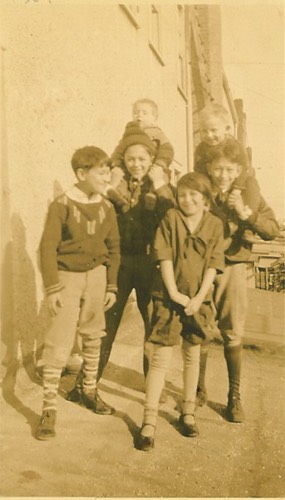 L-R, Judah Flax, (tenant Cassidy kid,) (rear) neighbor, Victor Flax, (rear) Doris Flax, Cassidy kid, (rear Arthur) Light, Uriel Flax, Shirley Light