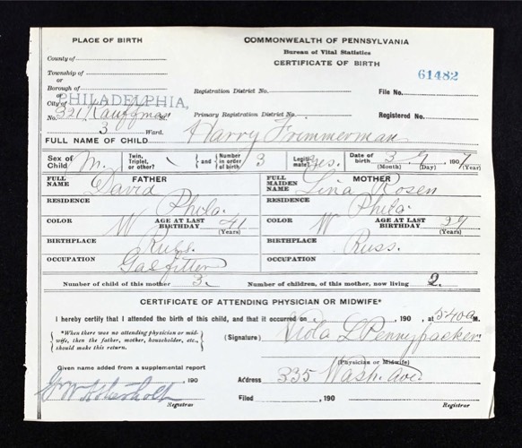 Harry Frimmerman (son of David) Birth Certificate 1907