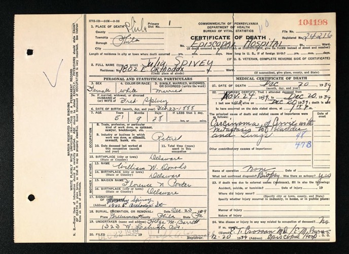 Julia Donaghue Spivey Death Certif - 1939 Phila